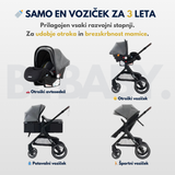 Je přizpůsobivý kočárek, který roste s dítětem. Sedadlo je nastavitelné, což umožňuje pohodlí a bezpečnost v každé fázi růstu dítěte.