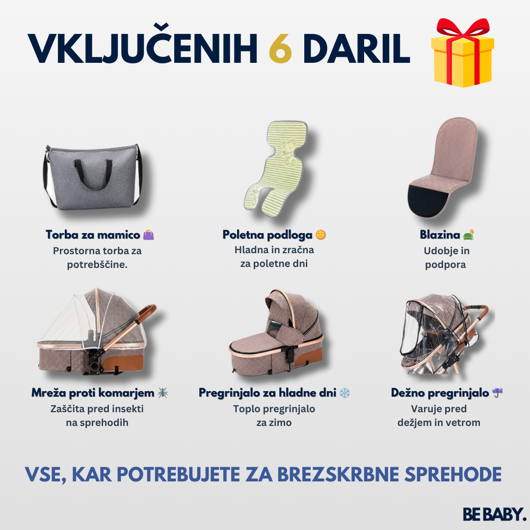 Při nákupu obdržíte zdarma pláštěnku, síť proti hmyzu, tašku pro maminky a letní podložku - vše pro zlepšení vašeho zážitku z jízdy.