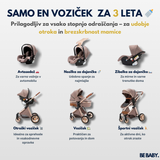 Je přizpůsobivý kočárek, který roste s dítětem. Sedadlo je nastavitelné, což umožňuje pohodlí a bezpečnost v každé fázi růstu dítěte.