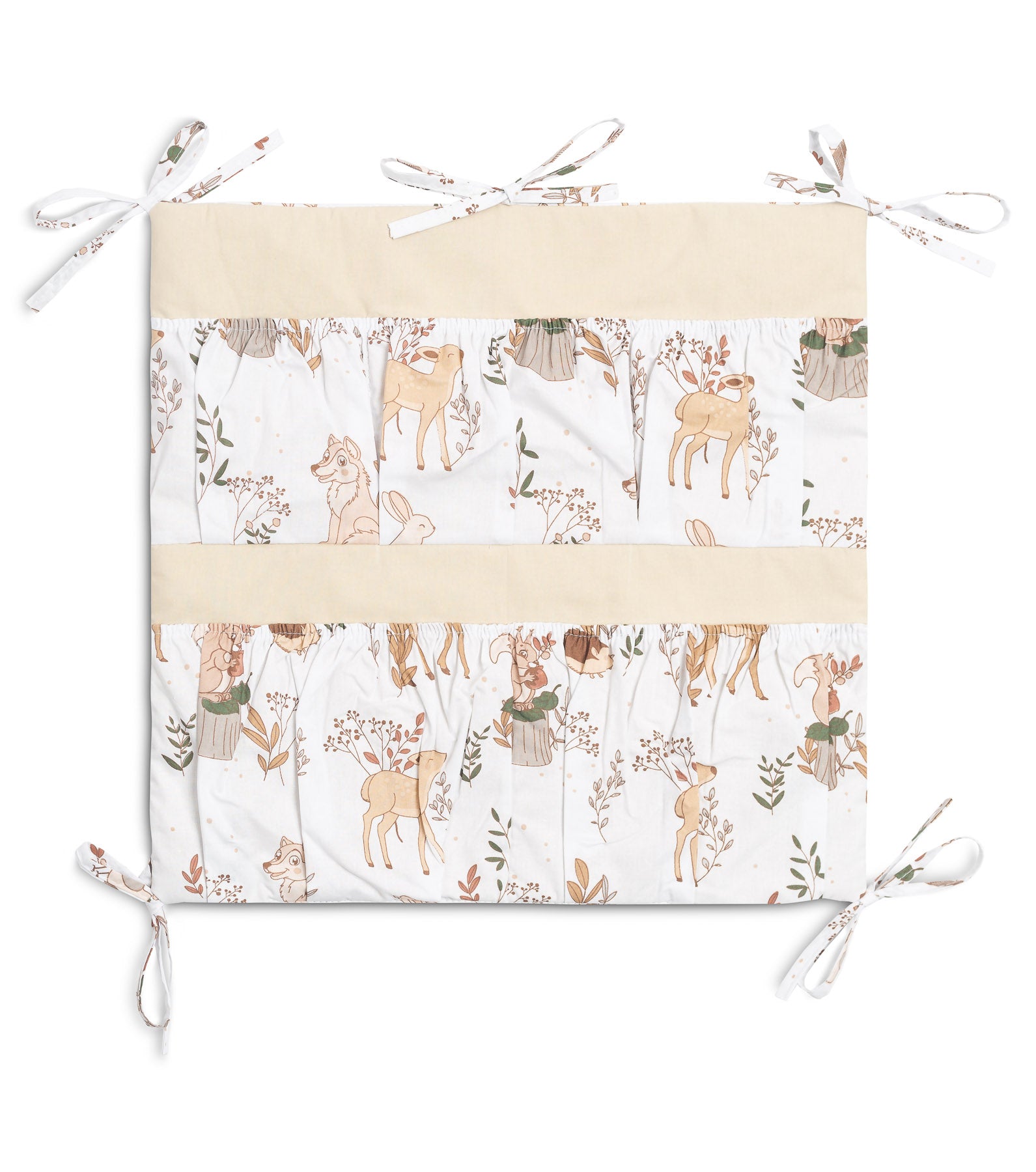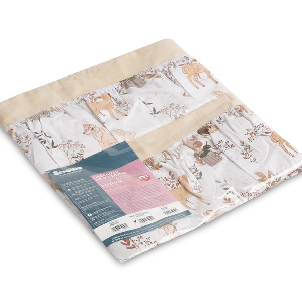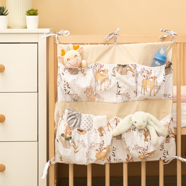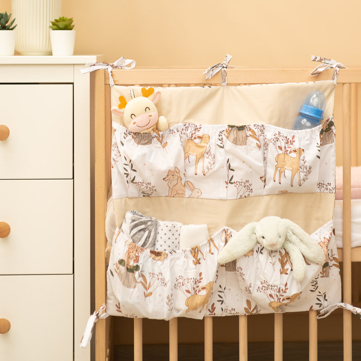 Organizér na postýlku není jen praktický výrobek, ale také ozdoba dětského pokoje. Má celkem 5 kapes, zesílených elastikou, které pojmou všechny potřebné doplňky. Organizér lze snadno připevnit na rám postýlky pomocí všitých pásků. Navíc je zesílen vrstvou silikonového flísu. Vnější část je lemována 100% bavlnou. Organizér lze kombinovat s dalšími výrobky z naší nabídky.