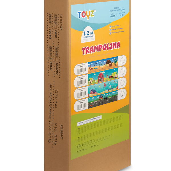 Dětská trampolína značky TOYZ je skvělým řešením pro aktivní děti. Trampolína vyrobená z pevných materiálů poskytne vašemu dítěti hodiny bezpečné a vzrušující zábavy, jak doma, tak venku. Konstrukce je navržena s ohledem na bezpečnost nejmenších, vybavena ochrannou sítí a stabilními nohami s protiskluzovými podložkami. Vícebarevné tematické vzory na síti přenesou vaše dítě do světa plného dobrodružství.