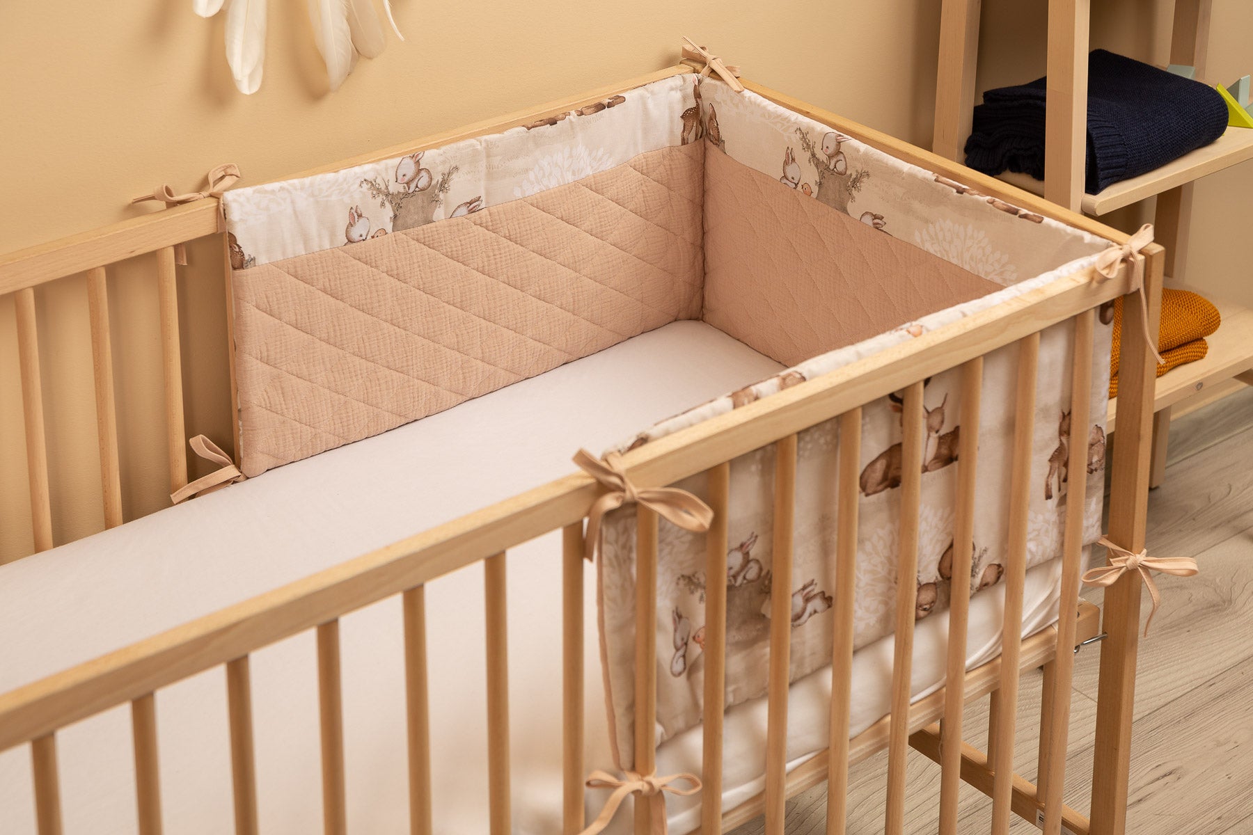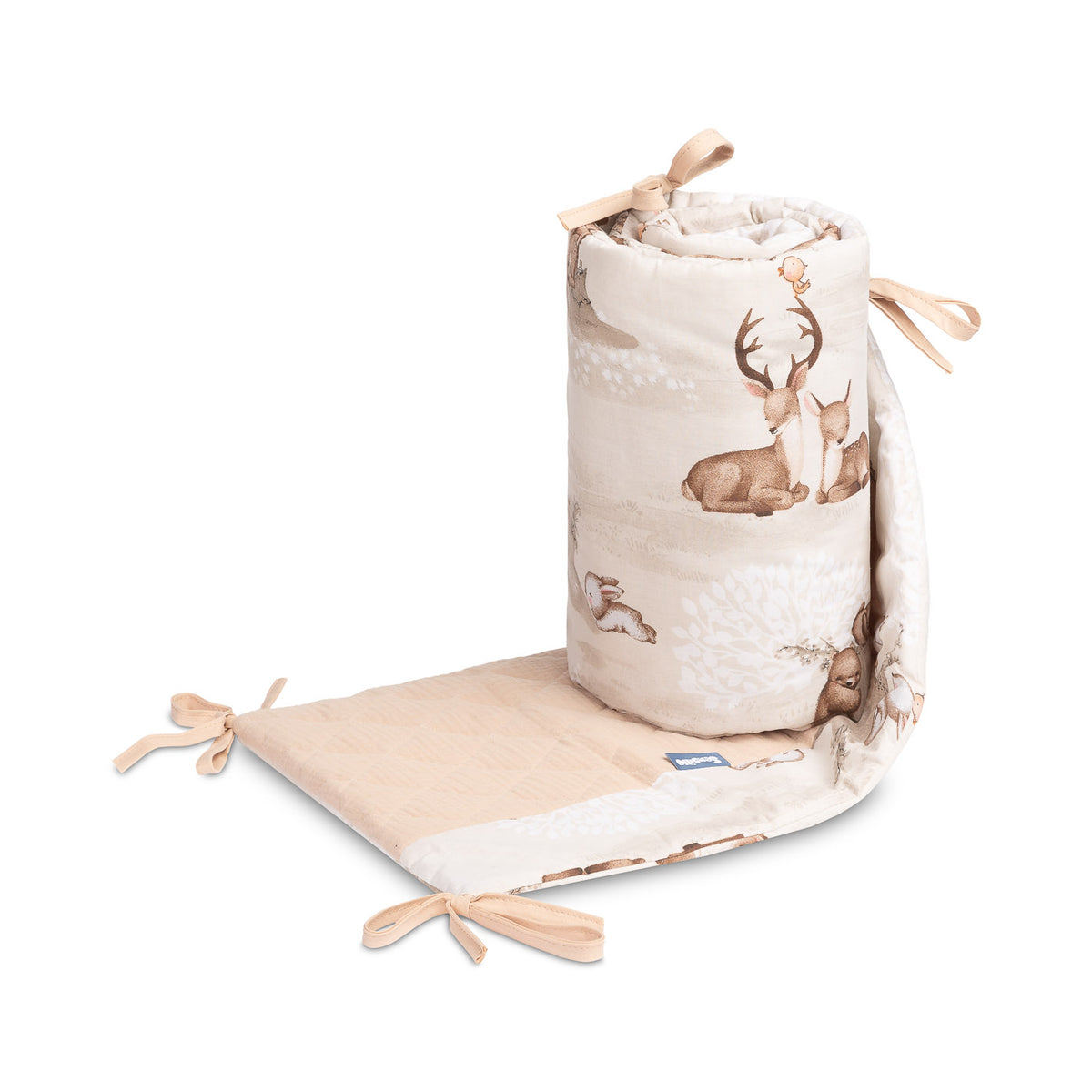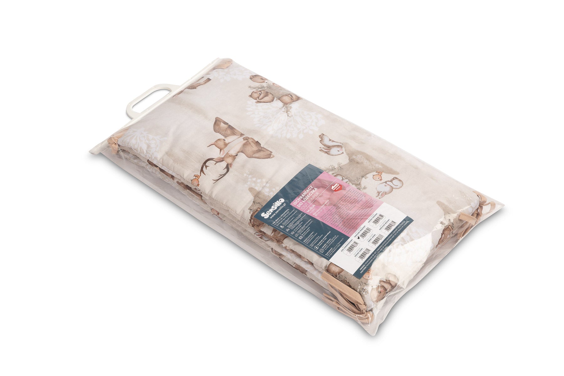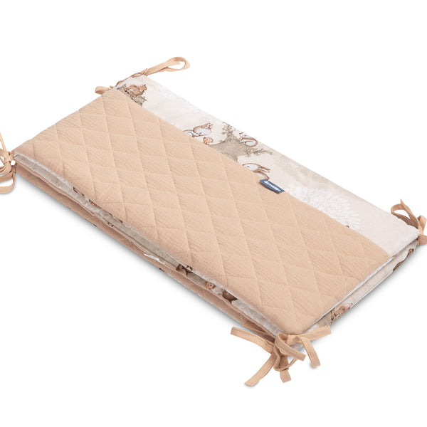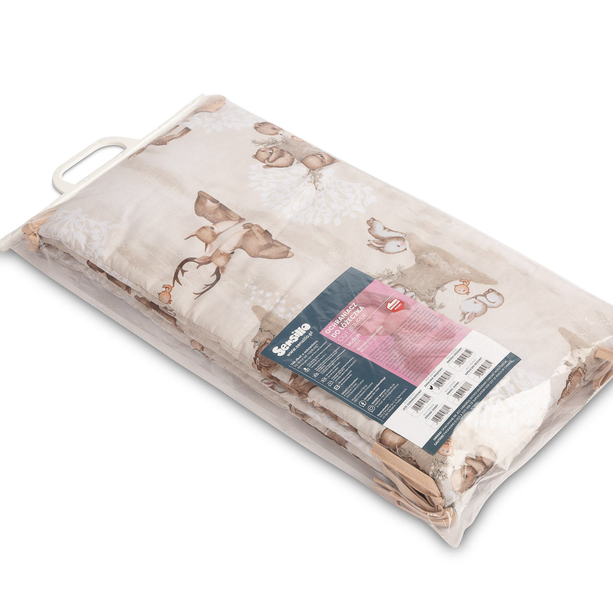 Ochranný lem na postýlku se hodí na každou standardní dětskou postýlku. Lem je vyroben z měkké tištěné bavlny a příjemného mušelínu na dotek. Výplň z polyesteru ochrání dítě před zraněním během pohybu v postýlce. Lem zůstane na svém místě díky páskům, kterými se připevní k příčkám postýlky. Je určen pro postýlku o rozměrech 120x60 cm. Lem bude skvělým doplňkem k dětskému vybavení.