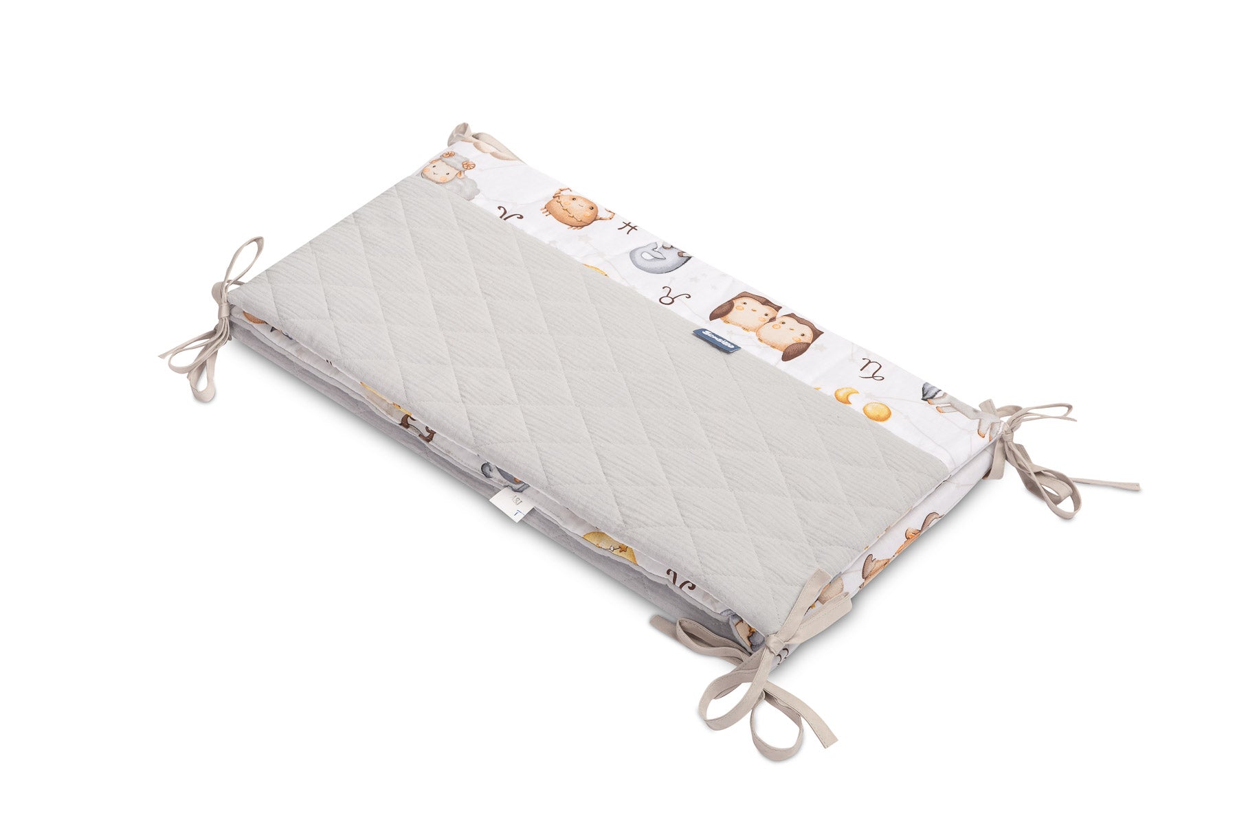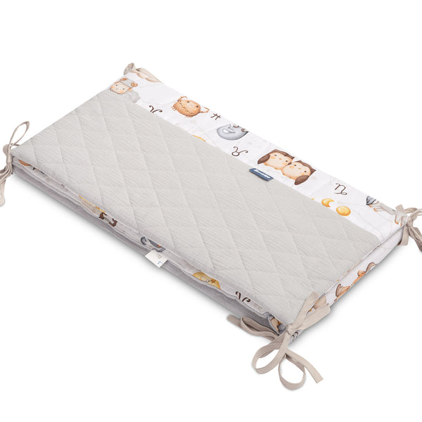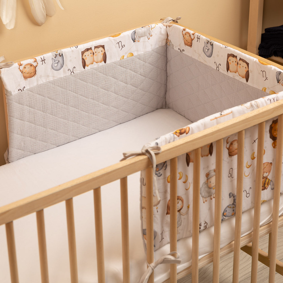Ochranný lem na postýlku se hodí na každou standardní dětskou postýlku. Lem je vyroben z měkké tištěné bavlny a příjemného mušelínu na dotek. Výplň z polyesteru ochrání dítě před zraněním během pohybu v postýlce. Lem zůstane na svém místě díky páskům, kterými se připevní k příčkám postýlky. Je určen pro postýlku o rozměrech 120x60 cm. Lem bude skvělým doplňkem k dětskému vybavení.